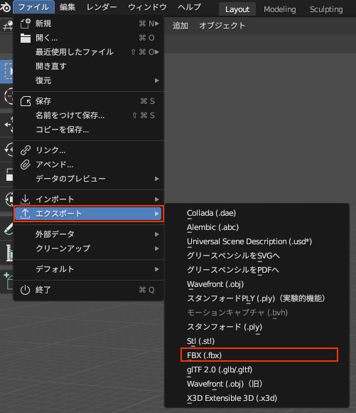 ③MeshとArmatureを選択したままファイル>エクスポート>FBXを選択