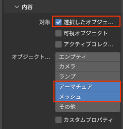 オブジェクトタイプ・・・アーマチュア、メッシュのみをチェック