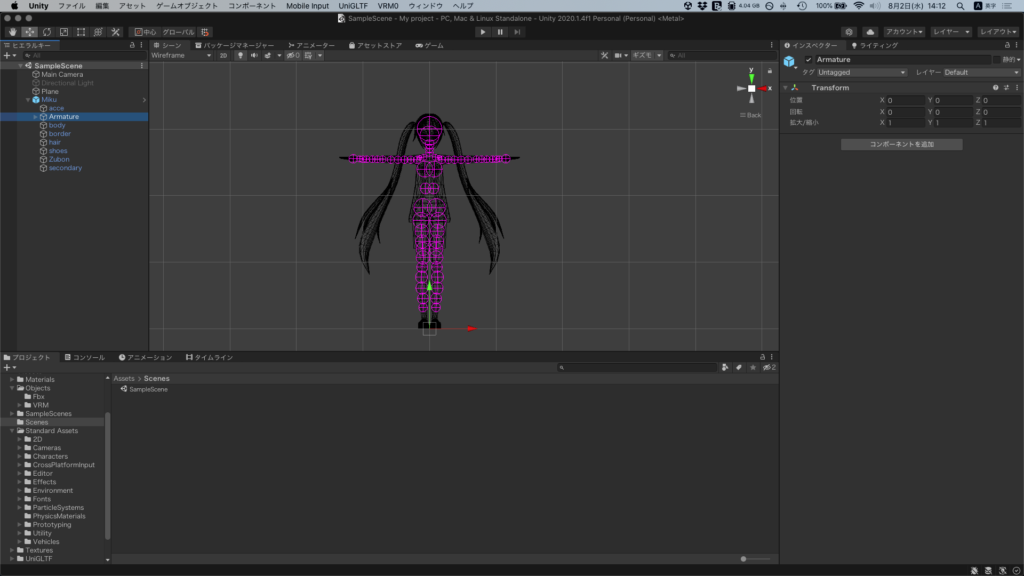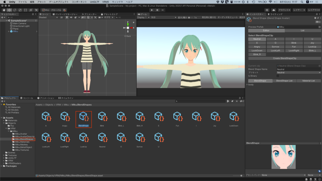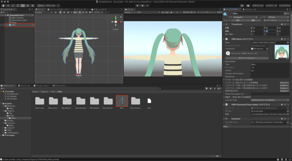 前回作ったVRMのMikuのフォルダからMikuをヒエラルキーにドラッグ&ドロップしvrmの設定を行なっていく。