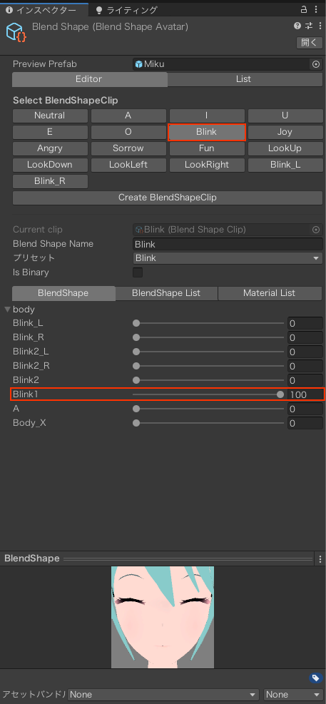 インスペクターでBlendShapeの項目を設定していく。