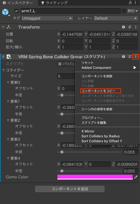 例えば右腕のSpirigbornColliderGroupコンポーネントを設定後、コンポーネントの右端の縦の…を押してコンポーンネントをコピーをする。