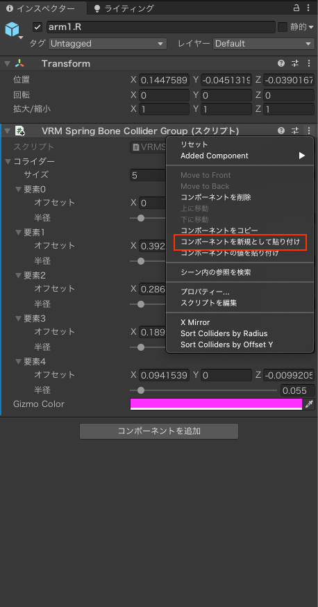そして左腕のアーマチュアの部分でSpirigbornColliderGroupのコンポーネントを出した後に、値のみを貼り付けを行い、x軸を反転させると効率的にできる。
