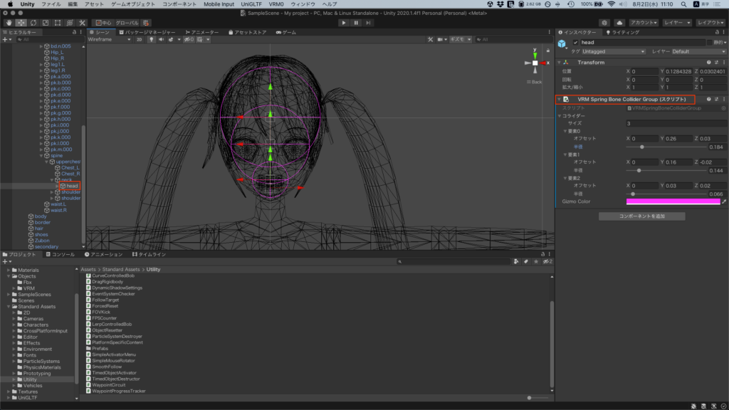アーマチュアの該当部分(画像はhead)を選択し、SpirigbornColliderGroupの設定する。