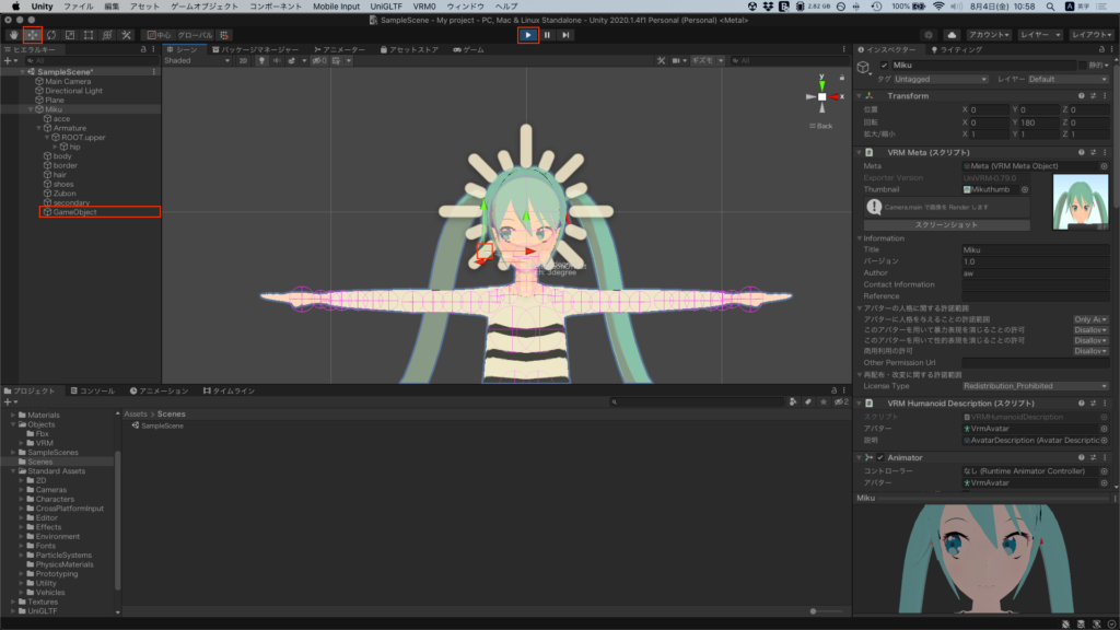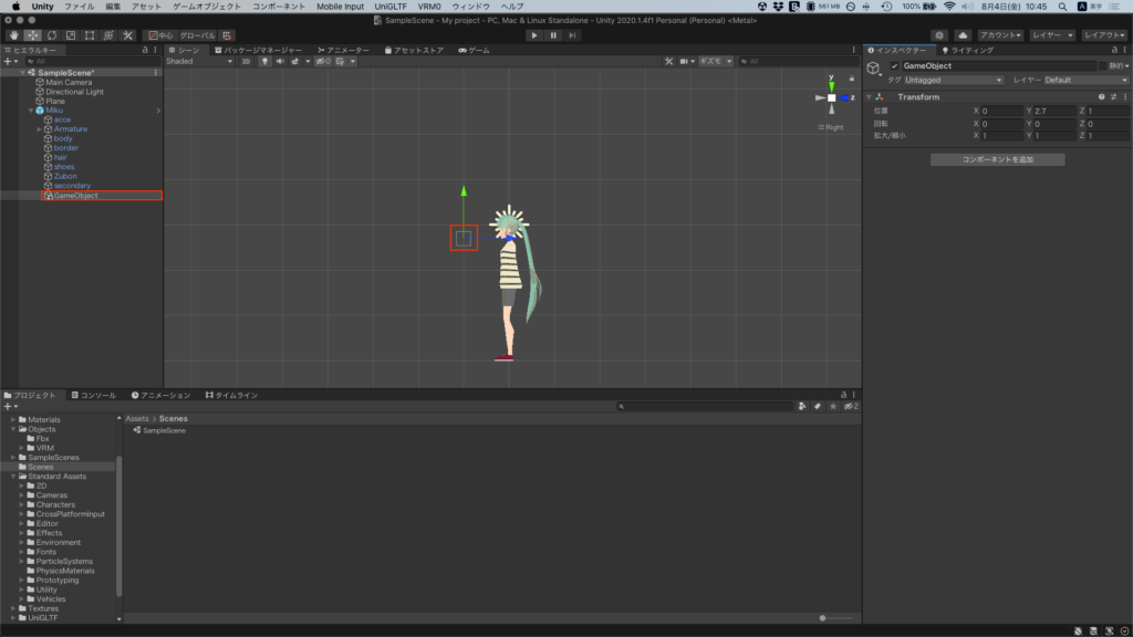 ヒエラルキーに空のGameObjectを作成、VRMの前方で視点の高さに位置付けてVRMの中にドラッグアンドドロップする。