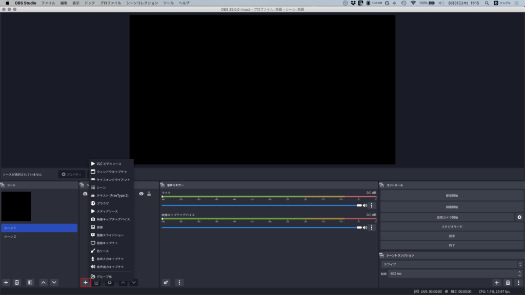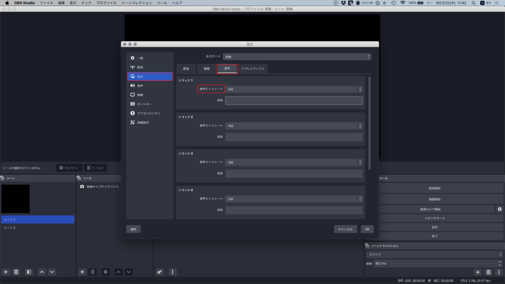 ソースで映像キャプチャーデバイスを設定すると、映像キャプチャデバイス側の音声ミキサーが表示されます。