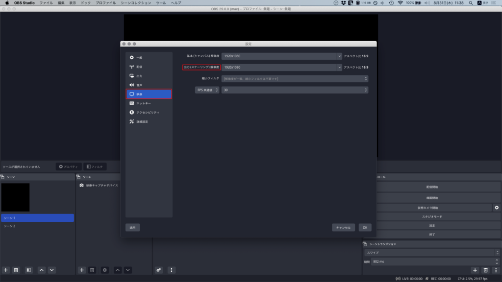 preferenceを開いて[映像]を表示し、出力(スケーリング)解像度を調整します。基準値:1920*1080
