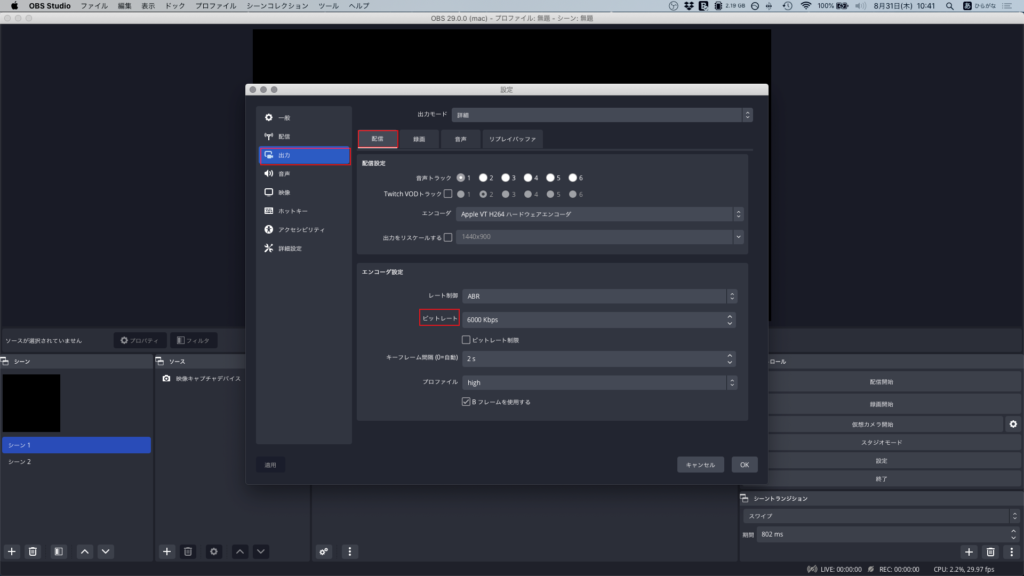 preferenceを開いて[出力]>[配信]を表示し、ビットレートの項目を調整します。基準値:6000kbps