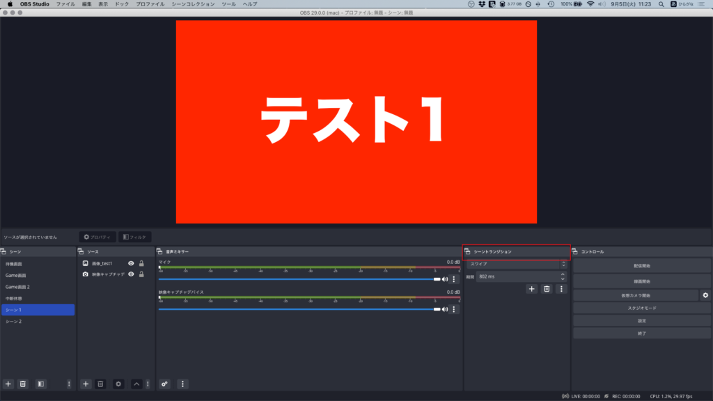シーン1を選択した後にシーン2を選択すると、設定したトランジションでシーン画面が遷移します。